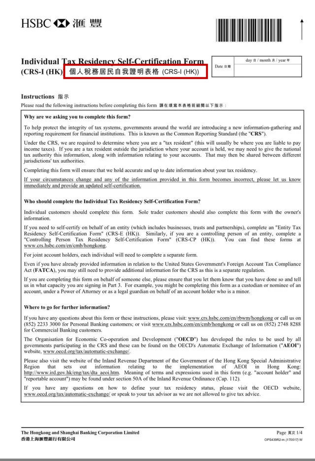 香港銀行需要賬戶持有人完成CRS標(biāo)準(zhǔn)調(diào)查金融賬戶稅務(wù)歸屬,即《個(gè)人稅務(wù)居民自我證明表》。