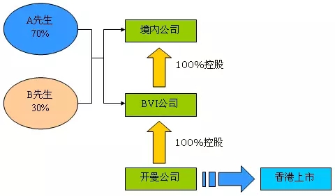 3.接著,對(duì)BVI公司增資,再與A先生和B先生進(jìn)行股權(quán)轉(zhuǎn)讓?zhuān)召?gòu)他們擁有的內(nèi)地公司的股權(quán),則內(nèi)地公司變?yōu)锽VI公司的全資子公司。BVI公司在開(kāi)曼群島或百慕大群島注冊(cè)成立一家離岸公司作為日后在香港掛牌上市的公司。